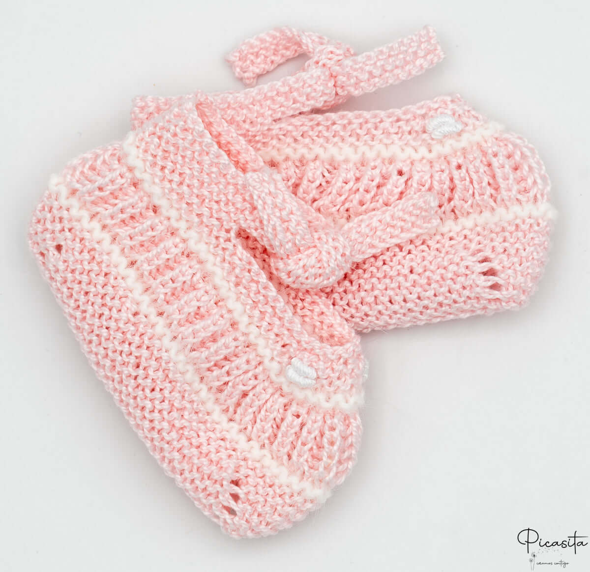 Respuesta: Están tejidos con Perlé Rosa DMC nº 5, Nylgorina y Rococó blanco. Son materiales de alta calidad, extremadamente suaves y transpirables, seleccionados específicamente para la delicada piel de un bebé.