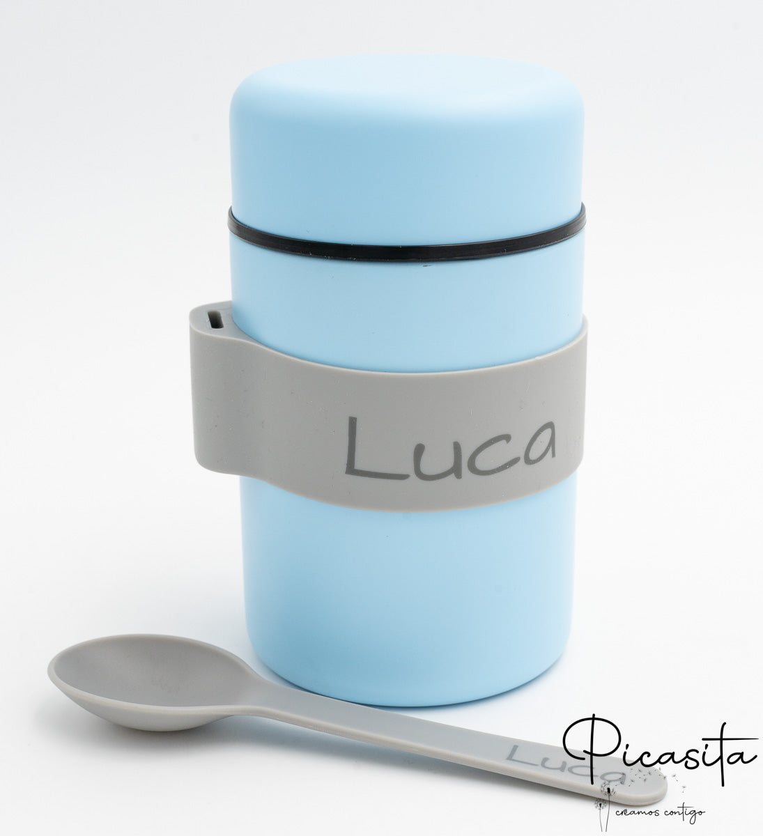 Fazemos com que este termo para comidas quentes seja inconfundível. Personalizamos tanto a banda de suporte como o cabo da colher gravando o nome por laser de alta precisão. Ao contrário dos autocolantes, esta técnica queima superficialmente o material deixando um acabamento elegante e monocromático (cinzento escuro/preto) que nunca se apaga, mesmo com uso intensivo. Para completar o equipamento do teu bebé, convidamos-te a descobrir a nossa gama de Louça Infantil Personalizada e combinar cores a condizer.